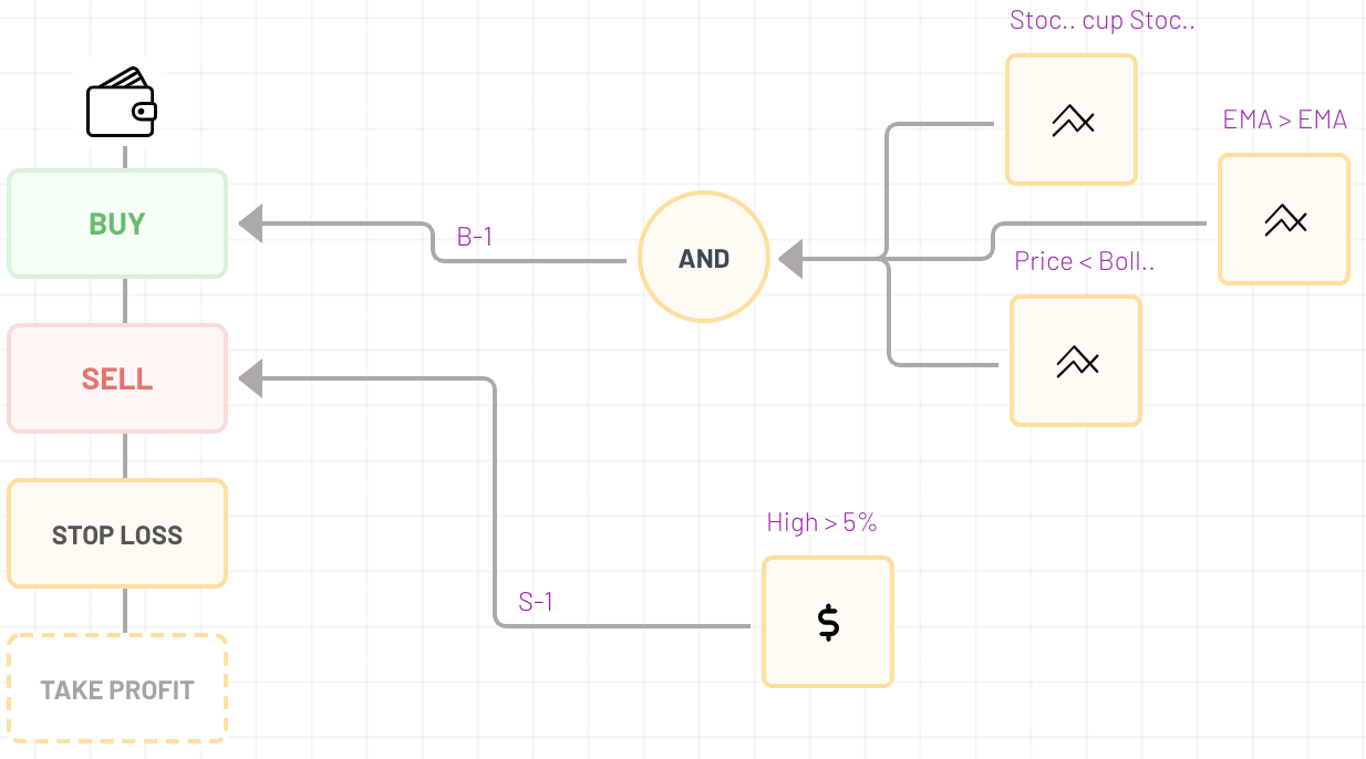 Everything revolves around a buy, sell, stop loss and take profit function. In order for these functions to be called, blocks need to be connected to them. Blocks have some sort of characteristic, like ‘price,’ ‘indicator’ or ‘pattern’ that will be triggered on certain conditions.