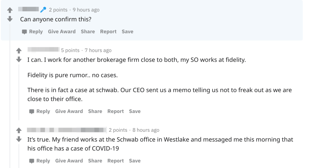 The original reports surfaced on the sketchy-and-vulgar “wallstreetbets” forum on Reddit, which is known for its reckless gambling-like approach to investing advice and gallows humor. The original rumor suggested that employees at both Charles Schwab and Fidelity offices in Westlake, TX had confirmed cases, but it appears that claims about the Fidelity offices are baseless.