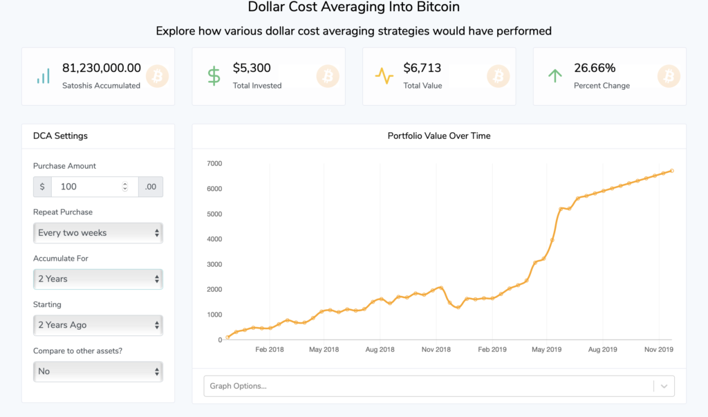 One of the easiest ways to learn what you could have made by dollar-cost averaging for a certain amount of time is on dcabtc.com. Here, you can set up imaginary situations to see what you missed out on. First, set up the amount deposited, then choose the frequency, then how long you have(‘nt) been accumulating for.
